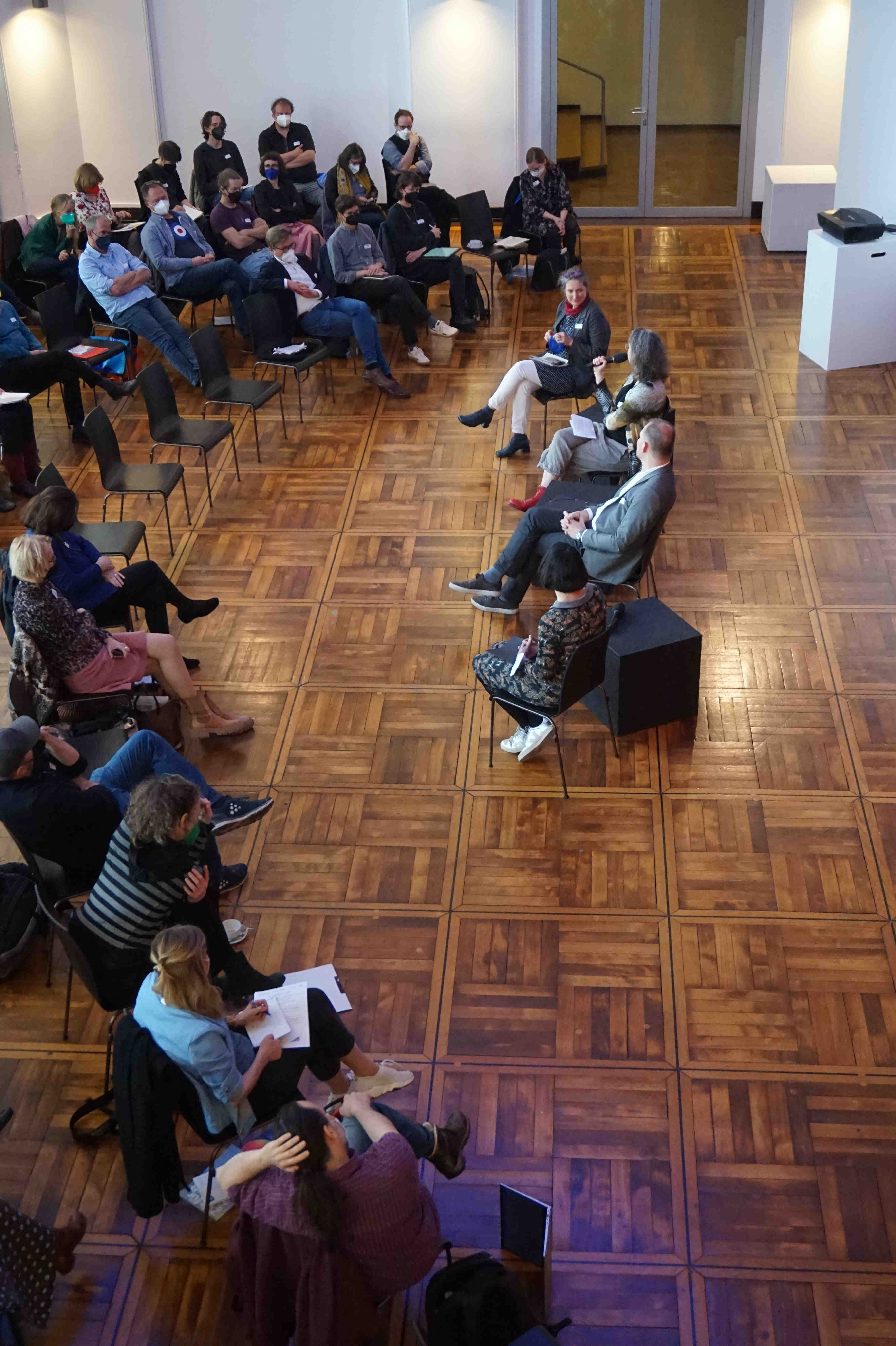 Ausgehend von Kurzreferaten von Dr. Oliver Parodi (Karlsruher Transformationszentrum) und Nicola Bramkamp (SAVE THE WORLD) laden zwei Aufbruch-Runden mit Claudia Schmitz (Deutscher Bühnenverein), Dr. Ralf Weiß (Reflexivo), Britta Velhagen (Tollhaus Karlsruhe), Tessa Beecken (Theater Freiburg), Felicia Maier (Kulturamt Freiburg), Annette König (Sparkasse Freiburg – Nördlicher Breisgau) und Sebastian Sladek (EWS Schönau) zu Kurzimpulsen und Austausch ein. Zum Abschluss werden Ergebnisse, Perspektiven und anstehende Handlungsschritte zusammengetragen.