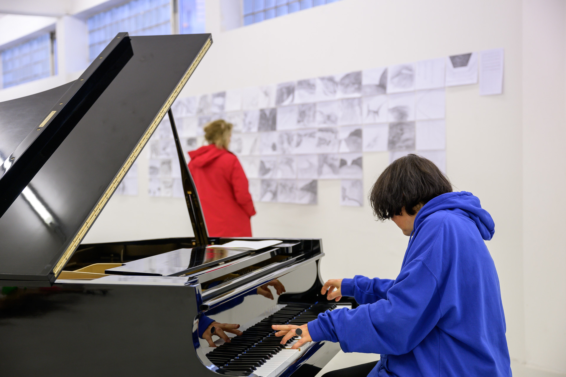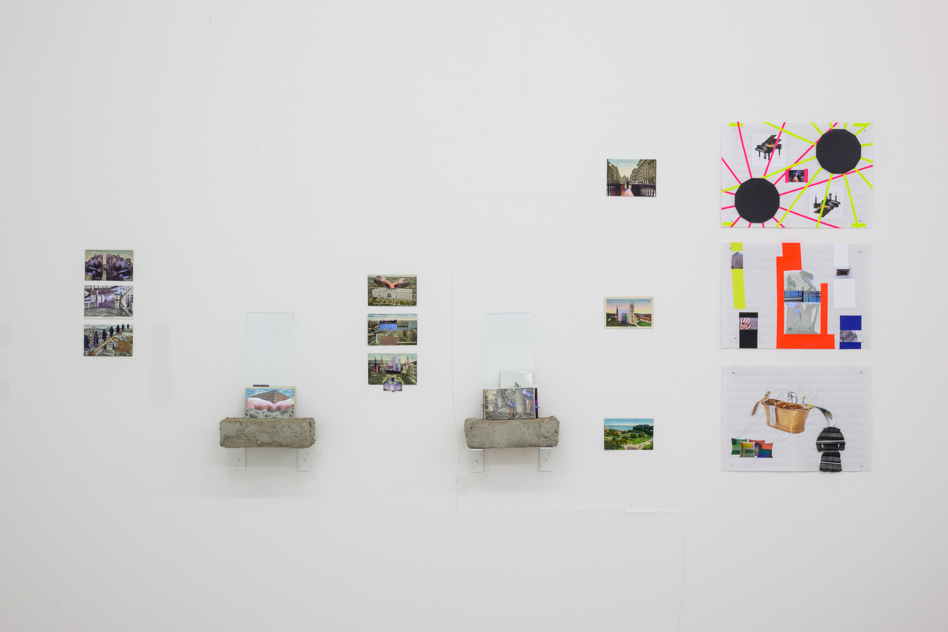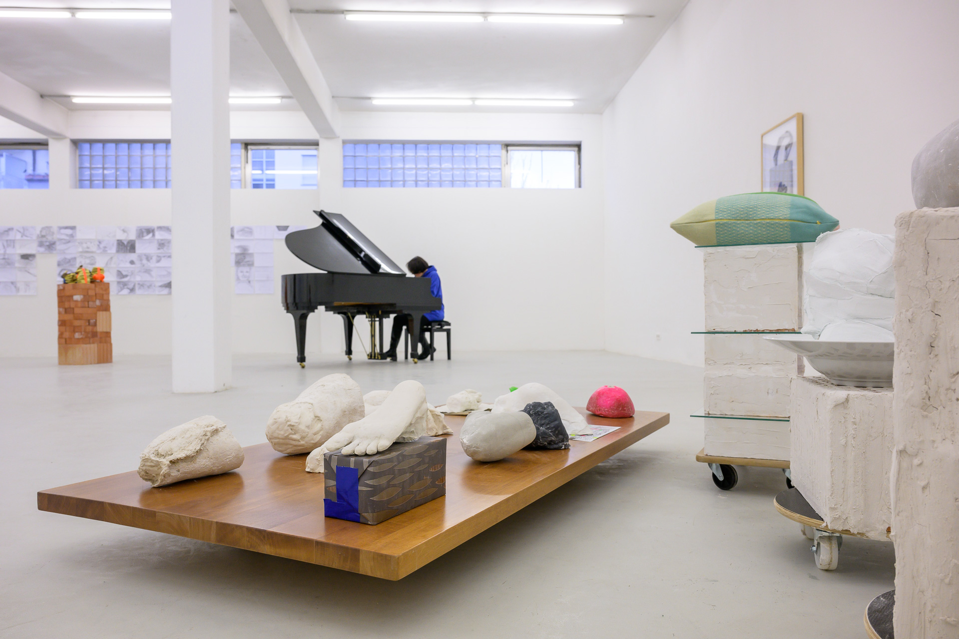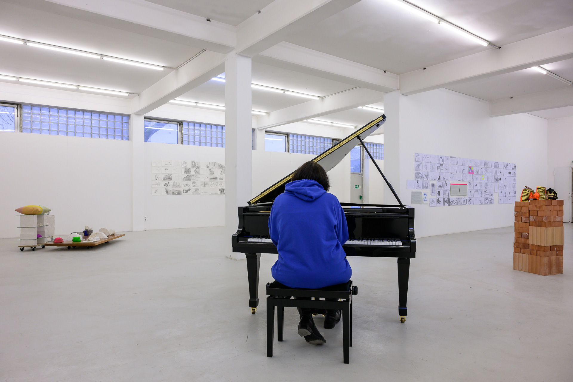 Einen Großteil der Ausstellung nimmt die Zeichnung ein. Hier liegt der Fokus auf einem humanistischen Prozess, die Landschaftskörper ihrer Kindheit in eine neue Erfahrungsebene zu bringen. Das Medium Zeichnung ist Michaela Tröscher sehr vertraut und bildet die Basis ihres künstlerischen Denkens. Es werden insgesamt drei Zeichnungsgruppen gezeigt. Alle drei belegen den beschrittenen Weg zum Exil. Gleich zu Anfang der Ausstellung werden wir mit zwei davon konfrontiert: The Drawn New York mit 111 Zeichnungen, die die geografische Realität der Stadt New York auf den Weg von ung. 50 km zwischen Lenzkirch und Freiburg überlagern, und New York´s Interior mit 100 Zeichnungen, die das Ineinandergreifen vom Alltagsraum und dem inneren Prozess thematisieren. The Drawn New York beginnt mit dem Blackforest Institut of Art in Lenzkirch als Ellis Island und endet mit dem Kunstverein Freiburg als der Speicher, Pier 21 am Hudson River .Die Zeichnungen der beiden Gruppen verändern sich in ihrer Struktur von der realistischen Darstellung in die offene fließende organische Form wie Wasser oder in eine geometrische Form wie ein Raster oder eine Kristallstruktur.Das einfach handhabbare Medium der Bleistiftzeichnung ermöglicht der Künstlerin die sichtbare Realität mit der inneren Vorstellung und Erinnerung zu verbinden. Durch die Überlagerung der unterschiedlichen Örtlichkeiten schafft Michaela Tröscher ihre NEUE WELT – und es funktioniert, da der Unterschied zwischen Fiktion und Realität in der Zeichnung nicht mehr zu erkennen ist.Eine weitere Zeichnungsgruppe bilden 40 Blätter. In diesem Werk trifft die Immigrationsgeschichte auf die zwölf Verwaltungsbezirke der Stadt Berlin. Die Künstlerin zeichnet Pflanzen in den von ihr ausgewählten historischen und politischen Orten. Sie setzt die Pflanzenzeichnungen und Orte zu ihrem Körper in Beziehung. So findet eine fragmentarische Aneignung des Ortes statt. In diesem Moment wird Berlin zu Winnipeg, der Hauptsiedlung der Isländer im ersehnten Kanada, wie es im Roman beschrieben wird. Der weitere Prozess ist das Abgießen des eigenen Körpers in Beton, Wachs und Gips, um dem immigrierten Körper einen realen Raum zu geben.Der Abschied, die Ankunft, die spektakulären Stadtansichten, die großartigen als auch die intimen und verspielten Momente eines in die Immigrationsgeschichte verfügten Daseins berühren uns bei den an sich selbst adressierten Postkarten. Anders als in den Zeichnungen wird die Grenze zwischen Fiktion und Realität sichtbar. Obwohl das Medium Postkarte uns am besten eine Auswanderung vortäuschen kann, wird durch die collagenhafte Umsetzung ihre Illusion deutlich. Zu den Postkarten gibt es keine klassisch verfassten Grüße. Es sind in Versform auf englisch und auf isländisch geschriebene Texte, die die Künstlerin Lyrics nennt, welche den konfliktreichen Prozess der Immigration beschreiben. Die Lyrik zur Postkarte Nr. 17 liegt zur Ansicht vor. Es werden in diesem Text The Genius Seven erwähnt. Dabei handelt es sich um die Group of Seven, ein Kreis kanadischer Landschaftsmaler am Anfang des 20. Jahrhunderts, die sich vornehmlich mit der Weite der kanadischen Landschaft beschäftigten, abgekoppelt vom alten Europa.In den Zeichnungen auf Packpapier, die gleichzeitig mit beiden Händen gezeichnet wurden und in der Ausstellung übereinander geschichtet liegen, verbindet Michaela Tröscher die Improvisationsmusik mit der Sprache der Lyrics. Am Klavier spielt sie diese Musikstücke ein und zeichnet zu diesen Aufnahmen im Atelier. Sie entstehen mit einer rhythmisierten Energie, die sich durch den Körper entlädt. Die Zeichnung zur Postkarte Nr.17 liegt auch hier zur Ansicht aus.Die ganze Rauminstallation The Immigration wird von dem Konzertflügel bestimmt. Der Konzertflügel als skulpturales Objekt, Klangkörper und Symbol nimmt eine beachtliche Stellung in dem erweiterten Kunstbegriff ein, von der Klanginstallation bis zur Performance. Beuys spricht von einer hörbaren Plastik oder vom materialisierten Klang.Dieses Instrument verschiebt die Grenzen zwischen Kunst, Theater, Musik und Leben. Seit ihrer Kindheit hatte Michaela Tröscher die Vision eine Pianistin zu sein. Neben dem Flügel sehen wir eine Pinselzeichnung eines Instruments gedruckt auf einer Leinentasche aus der früheren Zeit. Seit 2016 nennt sie sich The Icelandic Pianist und improvisiert am Klavier. Mit ihm zelebriert sie die Umsetzung ihrer Vision und verwandelt den Raum in einen Resonanzkörper, eine Bühne, die die Verbindung zu der Welt darstellt.Ist diese Bühne also ein reales Exil vom Schicksal, welches sich von der Fiktion emanzipiert hat, um das Gute zu leben, mag sich der Betrachter und die Betrachterin dieser Ausstellung fragen. Das Glück, die Euphorie des Ankommens, ist in der Musik zu hören. In dieser unkonventionellen Improvisation, die sich Stück für Stück aus der Bildhauerei entwickelt hat, aus der Transformation, die dicht an den einzelnen Stufen der künstlerischen Umsetzung im Bild, Wort und Körper passiert. Obwohl New York, der Sankt-Lorenz-Strom und die kanadischen Städte gleich intensiv von der Künstlerin erlebt werden, ist das Bild des guten Lebens, das die Immigrantin auf ihrem Weg bestärkt, ähnlich wie die Immigrierenden im Roman, mit Kanada verbunden. Das Spinnen der Beziehungen zu Mitmenschen, wie Vilém Flusser meint, in Zusammenarbeit mit ihnen, das verantwortungsvolle Verhalten in der NEUEN WELT, die ja für Michaela Tröscher das New Yorker und das kanadische Europa zugleich ist, nennt die Bildhauerin CANADIAN ATTITUDE.Diese neue offene Haltung lässt sich an der Skulptur Canadian Pancake ablesen. Die auf Rollen stehende Arbeit hat keinen festen Boden und besitzt die Schönheit einer Figur in Bewegung. Dem gegenüber steht die Skulptur American Pancakes, welche eine architektonische Anmutung hat und eine abgeschlossene Geschichte vermittelt.