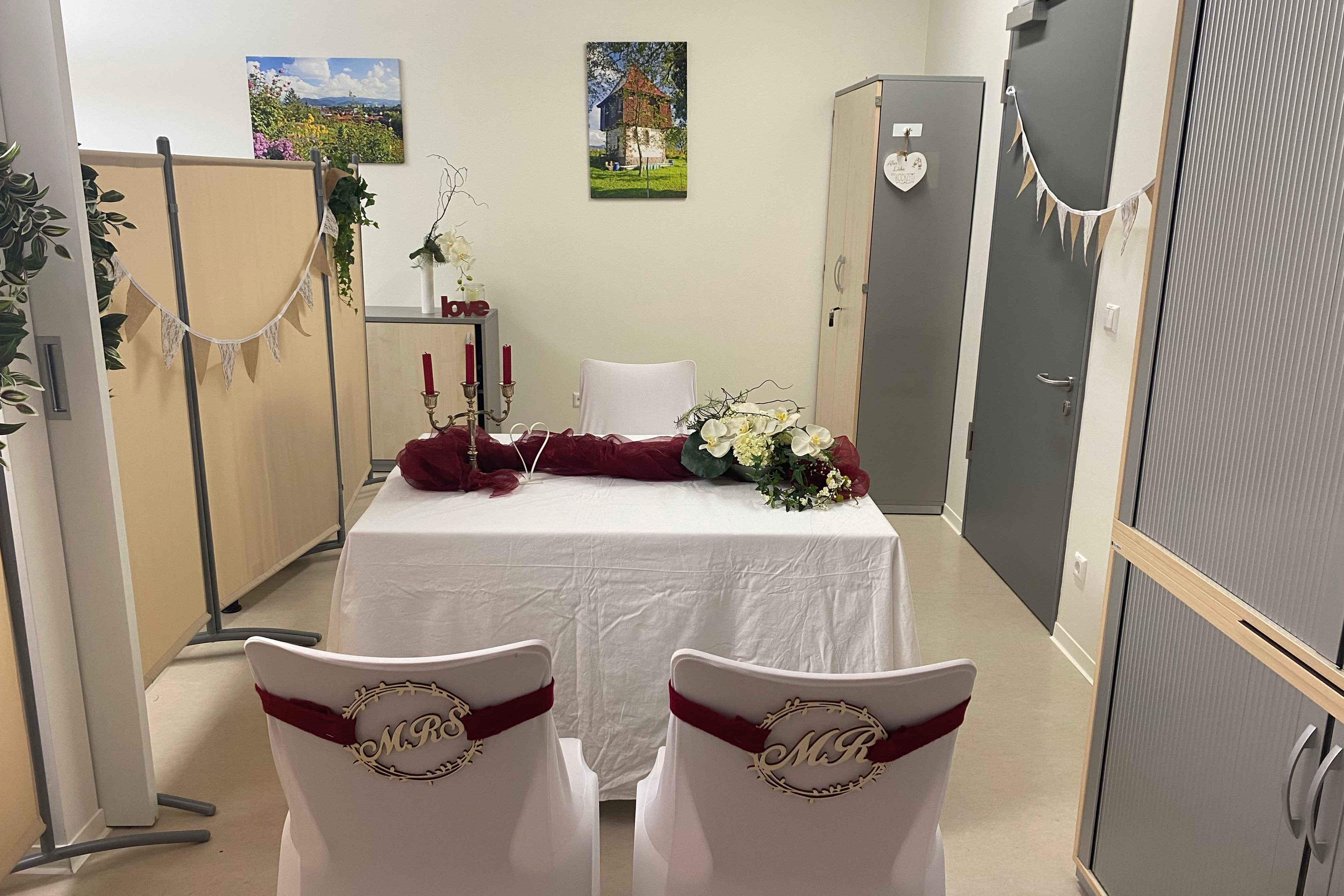 Durch den Neubau des Rathauses finden unser Trauungen aktuell im "Übergangsrathaus" in den Büros statt. Hier wird sozusagen aus zwei Büros ein Trauzimmer gemacht, was sich durchaus sehen lassen kann.