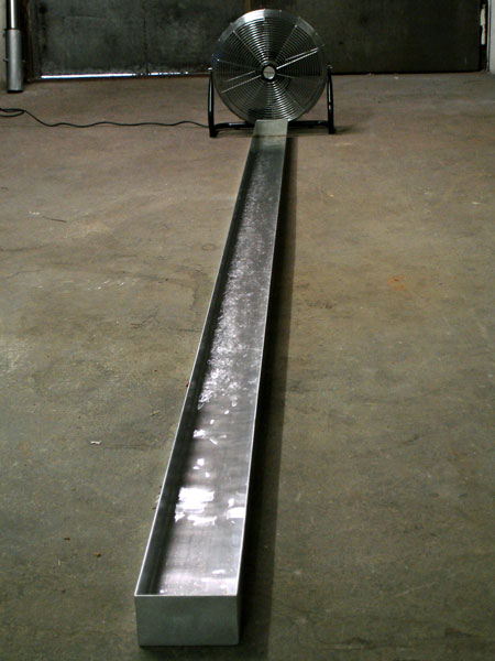 Der Schweizer Roman Signer versteht sich als Bildhauer von "Ereignissen", ebenso als Spieler und Tüftler. Mit seinem dynamischen Werkbegriff setzt er auf das Energiepotential der Natur. Seine Materialien sind die Elemente Wasser, Feuer, Luft, Erde und Alltagsgegenstände wie Leiter, Eimer, Holzkisten und Schnüre. Was herauskommt, kann spektakulär, aber auch lakonisch, witzig-poetisch sein. In der Installation o. T. (2005) dient ein vier Meter langes, schmales Stahlbecken als Auffanglager für Wasser. An einem Ende steht ein Ventilator: Die Luftzufuhr versetzt die Wasseroberfläche in Bewegung und beschleunigt den natürlichen Verdunstungssprozess, die Phasenumwandlung vom flüssigen zum gasförmigen Aggregatzustand. Eine augenzwinkernde Hommage an den Transformationsprozess der Natur, dessen Teil wir sind. Diese Arbeit wird vom Sammler Hans Rohr, Baden (CH) freundlicherweise zur Verfügung gestellt, die Basler Galerie Stampa sorgte für die Vermittlung