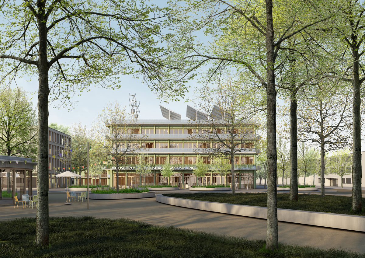 Die erforderliche Verdichtung findet am Drachenweg statt. Dabei werden viele große Bestandsbäume erhalten. Die grüne Freifläche "Moosgarten" wird durch einen Spiel- und Quartiersplatz ergänzt. Das Multifunktionsgebäude "Mooswaldhaus" bildet den Eingang zum Quartier und sieht im Erdgeschoss eine Supermarktnutzung vor. Im ersten Obergeschoss sind Arztpraxen vorgesehen, darüber zusätzliche Wohnungen.