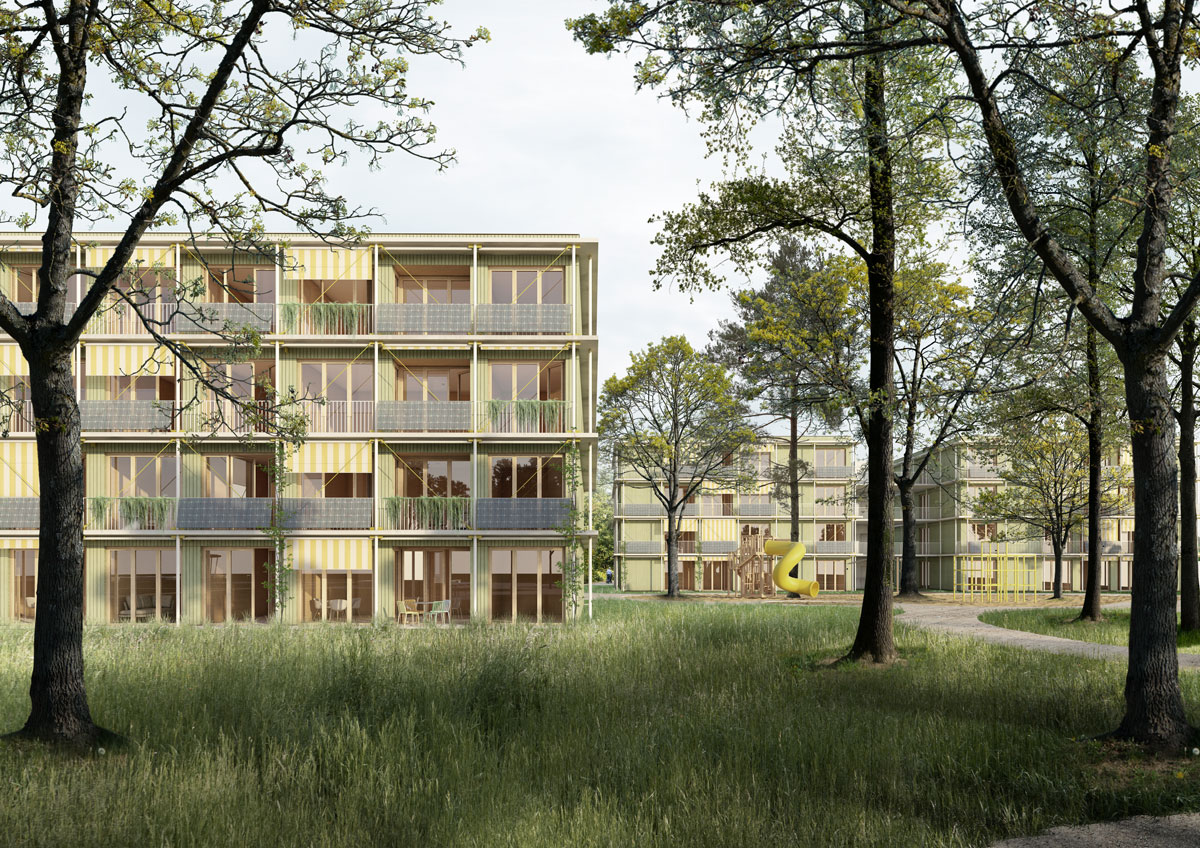 Der Siegerentwurf hatte die Aufgabe, die Reihenhäuser im Ochsensteinweg zu erhalten. Sie bleiben nunmehr bestehen und werden schrittweise saniert. Zwischen den bestehenden Gebäudezeilen entstehen ergänzend Holzhybridhäuser mit 30 Wohnungen.