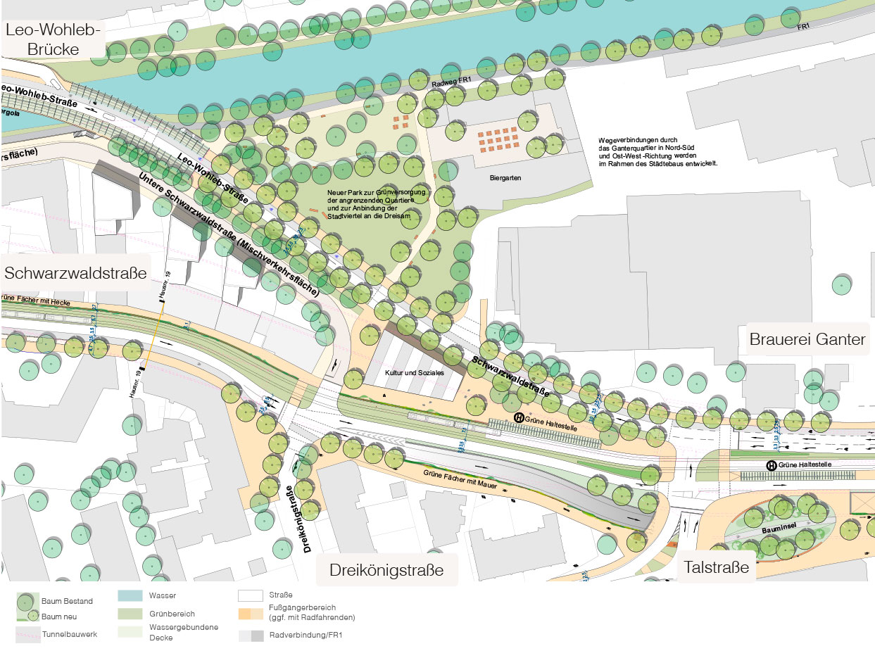 Über die Leo-Wohleb-Brücke hinweg könnte die attraktive Wegeverbindung Richtung Osten weitergeführt werden. Wenn lediglich eine Verkehrsspur auf der Brücke bleibt, verbringen zu Fuß Gehende eine Pause unter einer schattenspendenden Pergola. Eine Treppenanlage führt von der Leo-Wohleb-Straße zum neuen, attraktiven Dreisamufer. Der Ganter-Biergarten könnte um einen neue Grünfläche, den „Ganterpark“ direkt am Ufer, ergänzt werden.
