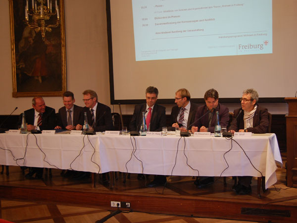 Daher stelle das Ausbalancieren von Zielkonflikten eine besondere Herausforderung für Politik und Verwaltung dar. Weil Freiburg länger und stärker wächst als bisher angenommen, bestehe dringender Bedarf an neuem Wohnraum. Hierbei gelte es jedoch, die landschaftlichen und städtebaulichen Qualitäten Freiburgs zu erhalten. Oberbürgermeister Salomon wies darauf hin, dass der gesetzliche Auftrag, vorrangig die Innenentwicklung zu fördern, teilweise zu Widerständen in der Bürgerschaft führe. In seinen weiteren Ausführungen ging er auf die aktuelle Situation auf dem Wohnungsmarkt ein. Neben der das Angebot übertreffenden Nachfrage führe die Flucht in Sachwerte aufgrund von Finanzmarkt- und Eurokrisezu einem noch stärkeren Druck auf die Preise. Salomon ging in seiner Begrüßung auch auf die stellenweise vorgebrachte Kritik ein, Freiburg wachse zu stark. So betonte er, dass es weder möglich noch Ziel sein könne, eine „Käseglocke“ über Freiburg zu stülpen. Die freie Wahl des Wohnortes gelte für Gesamtdeutschland, also auch für Freiburg.
