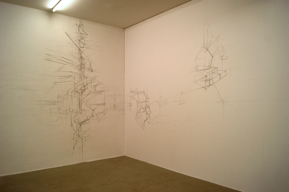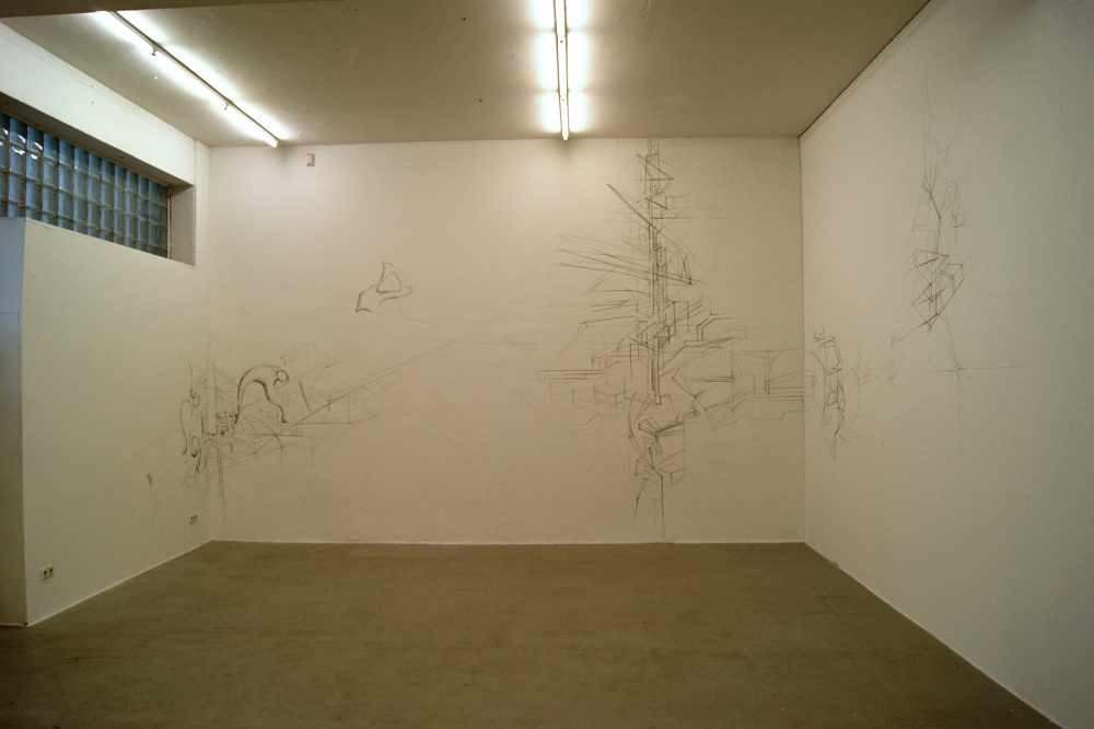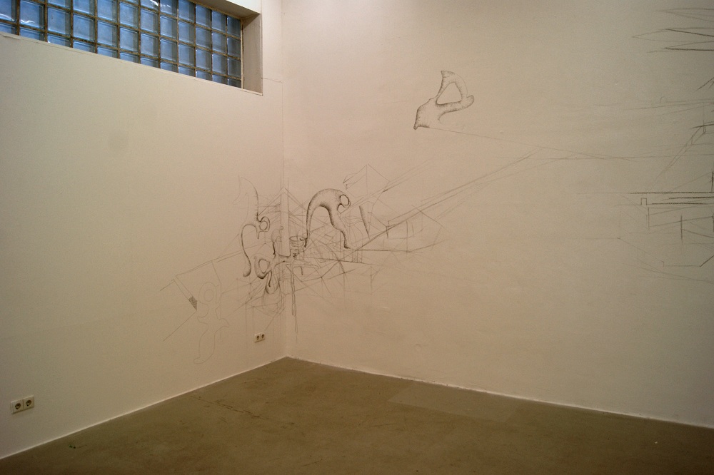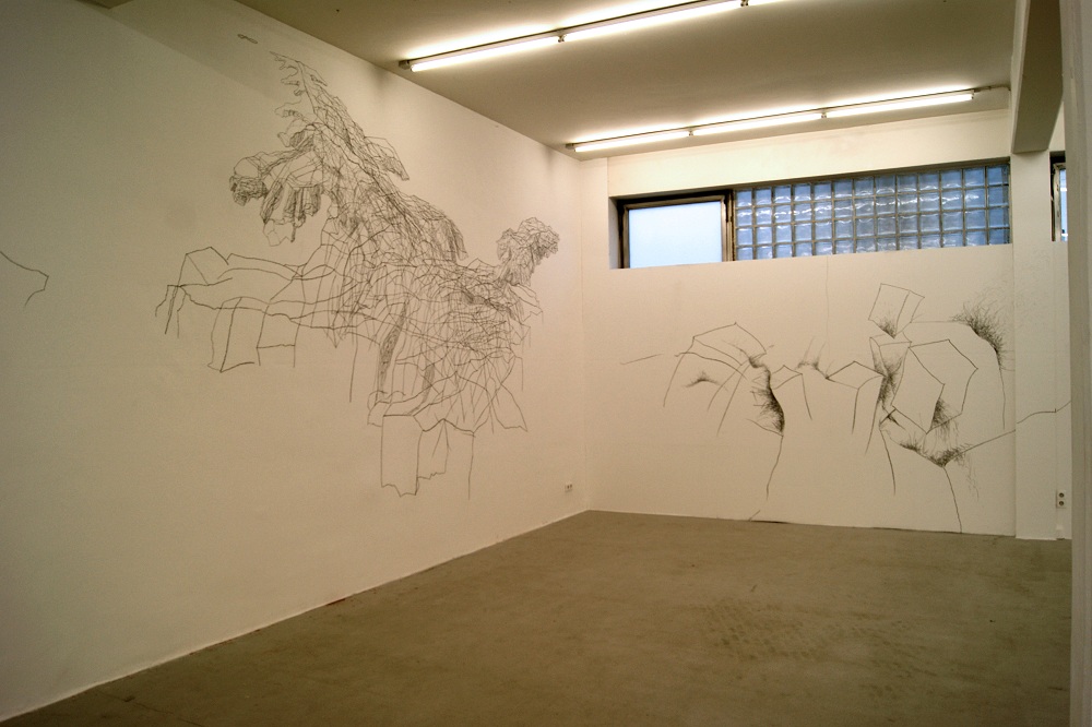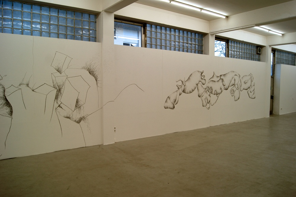 Die wandfüllenden Zeichnungen bleiben jedoch nicht singulär und abgegrenzt, sondern verbinden sich an ihren Rändern mit der jeweiligen benachbarten Zeichnung. Die dadurch entstehenden Schnittmengen sind Begegnungen zweier individueller künstlerischer Systeme, die sich sowohl als Konfrontation als auch als Verflechtung zeigen können.